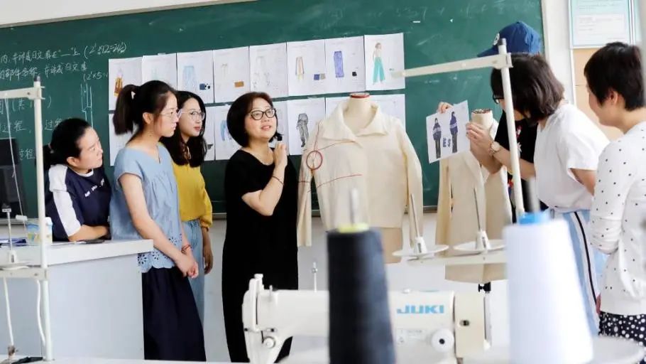 (王朝晖老师(左四)指导学生进行服装设计现场操作)