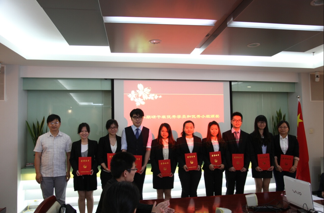会上,张晓冬对本期研究生骨干班开展情况进行了总结,研干班全体学员通过参与高雅艺术欣赏、主题讲座、参观交流、素质拓展、实践调研等特色鲜明、内容丰富的活动,有所收获和进步,达到了预期目标。并激励着研干班的同学继续挖掘自己的潜能,传递正能量,在未来更好的为广大师生服务。沈洁为学员代表颁发了结业证书。俞昊宣读本期培训班优秀学员和优秀小组名单,并为优秀学员代表及获得优秀小组的第三小组成员代表颁发证书。