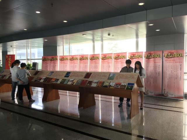 活动中,长征题材的文学作品展真实生动地再现了长征这一人类历史上的伟大壮举,展出书籍题材丰富、主题鲜明。比如《长征》按照时间跨度与地域维度为基本架构,从微观到宏观全景式回顾了长征的历程;《战典》以崭新的视野和独到的见解,揭示我军血脉永续、根基永固的根本所在;《遵义会议精神研究丛书》探讨了遵义会议精神与长征区域文化发展之间的内在关联;《大长征》生动地记述了长征这一人类历史丰碑,以细腻的笔触传承长征形成的革命传统及孕育的宝贵精神;《穿越时空看长征》带你穿越八十多年前的历史时空,领悟红军长征胜利的真谛。本次书展对推荐书目进行了内容推介,吸引了不少同学驻足翻阅,而同步进行的长征知识问答及留言感动等活动,也得到读者们的积极参与和支持。