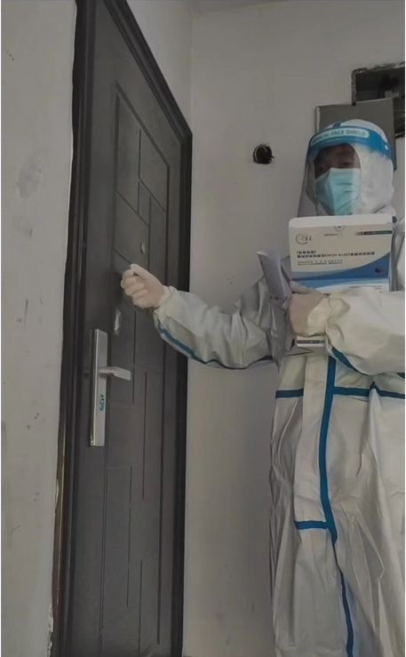 罗理达作为楼栋服务组志愿者上门发放防疫物资